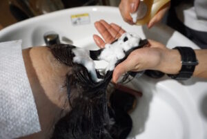 カウンセリングが完了したら、いよいよ施術のスタートです。当店の「髪質改善カラー」は、髪と頭皮への負担を最小限に抑えるため、特別な髪質改善成分を配合した独自のカラー剤を使用。カラーリングの前に髪と頭皮を薬剤から保護する施術をし、刺激を抑えながら髪をいたわります。