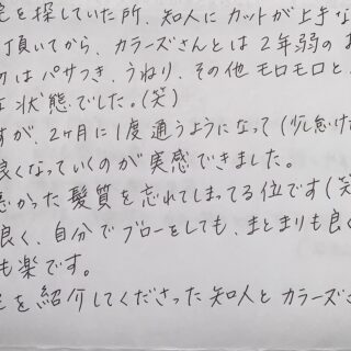 ずっと良い美容院を探していたところ、知人にカットが上手な美容院があると紹介していただいてから、カラーズさんは2年弱のお付き合いになります。最初はパサつき、うねりその他諸々と私の髪は...