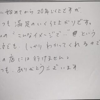 通い始めてから20年以上ですが、いつも満足いく仕上がりです。 私のこんなイメージで…と言う注文でもしっかりわかってくれるので、他の店には行けません。 いつもありがとうございます