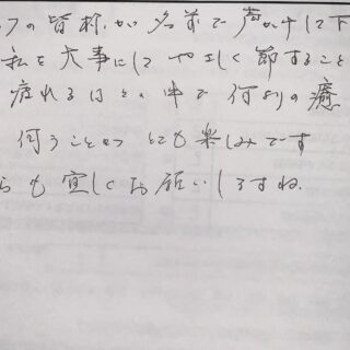 スタッフの皆様が名前で声掛けしてくださり、とても私を大事にして優しく接することが心身疲れる。日々の中で何よりの癒しとなります。 毎月伺うことがとても楽しみです。これからもよろしくお...